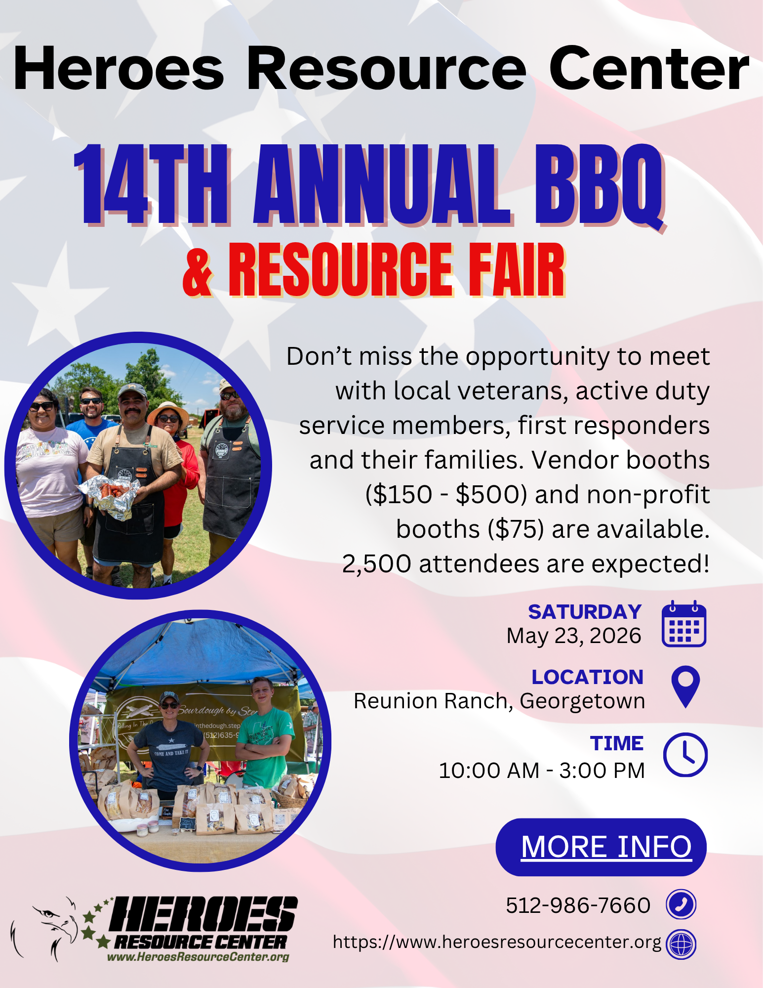 We’d like to invite your organization to be a vendor at our upcoming Heroes Resource Center BBQ, a community-focused event supporting veterans, first responders, active-duty military personnel, and their families. We expect 2,500 attendees. This is a great opportunity to sell your products, connect with the community, and gain valuable exposure.