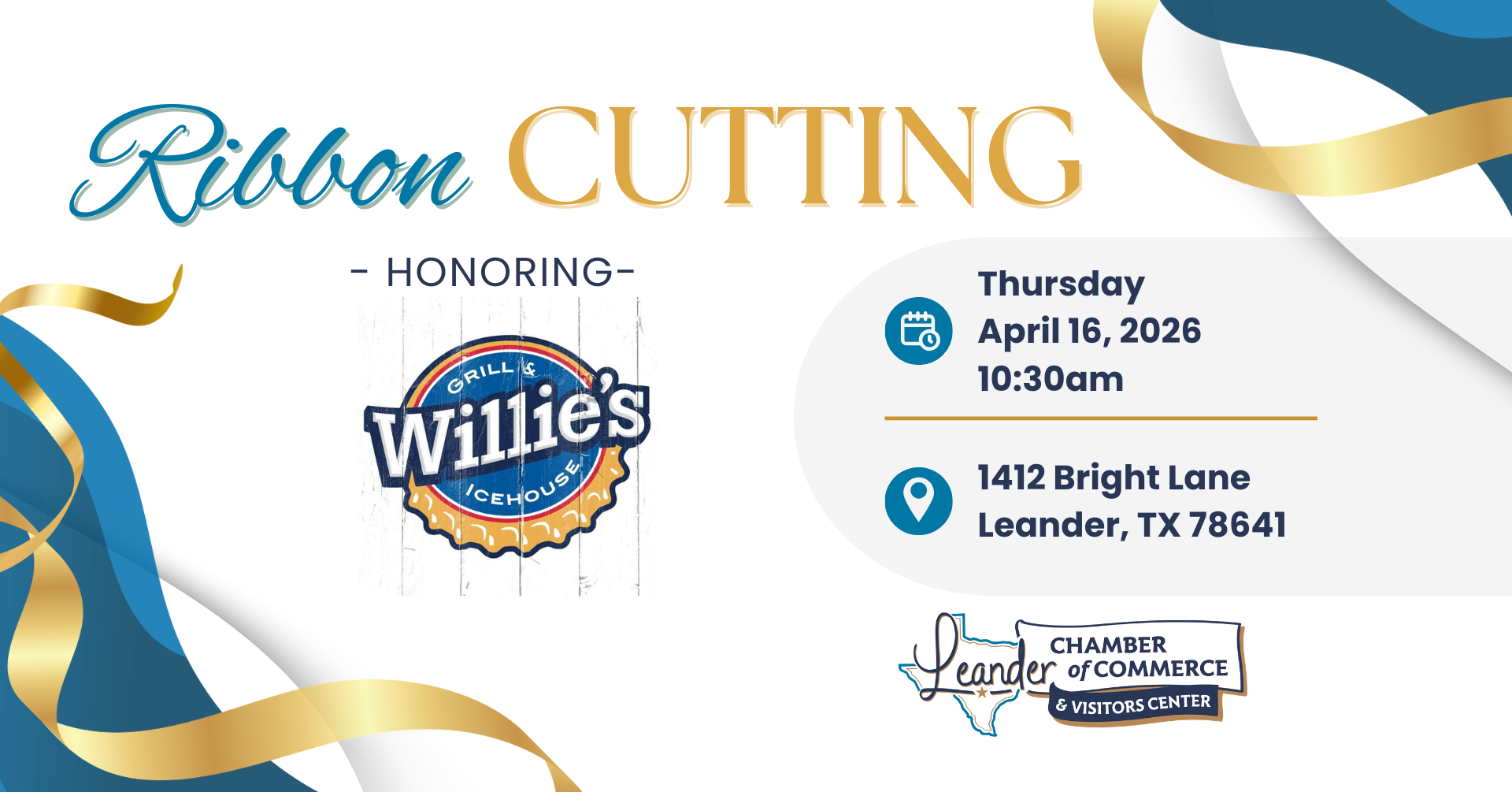 Join us as we welcome Willie's Grill & Icehouse to the community with an official ribbon cutting ceremony! Willie’s brings the classic Texas Icehouse experience to the neighborhood—serving up a made-from-scratch menu, ice-cold beverages, and a whole bunch of good times. It’s the perfect spot to gather with friends, enjoy great food, and celebrate another fantastic addition to our local business community. 📅 Date: April 16, 2026 Come out, meet the team, connect with fellow chamber members, and help us celebrate their grand opening! We hope to see you there as we give Willie’s Grill & Icehouse a warm Leander welcome. |